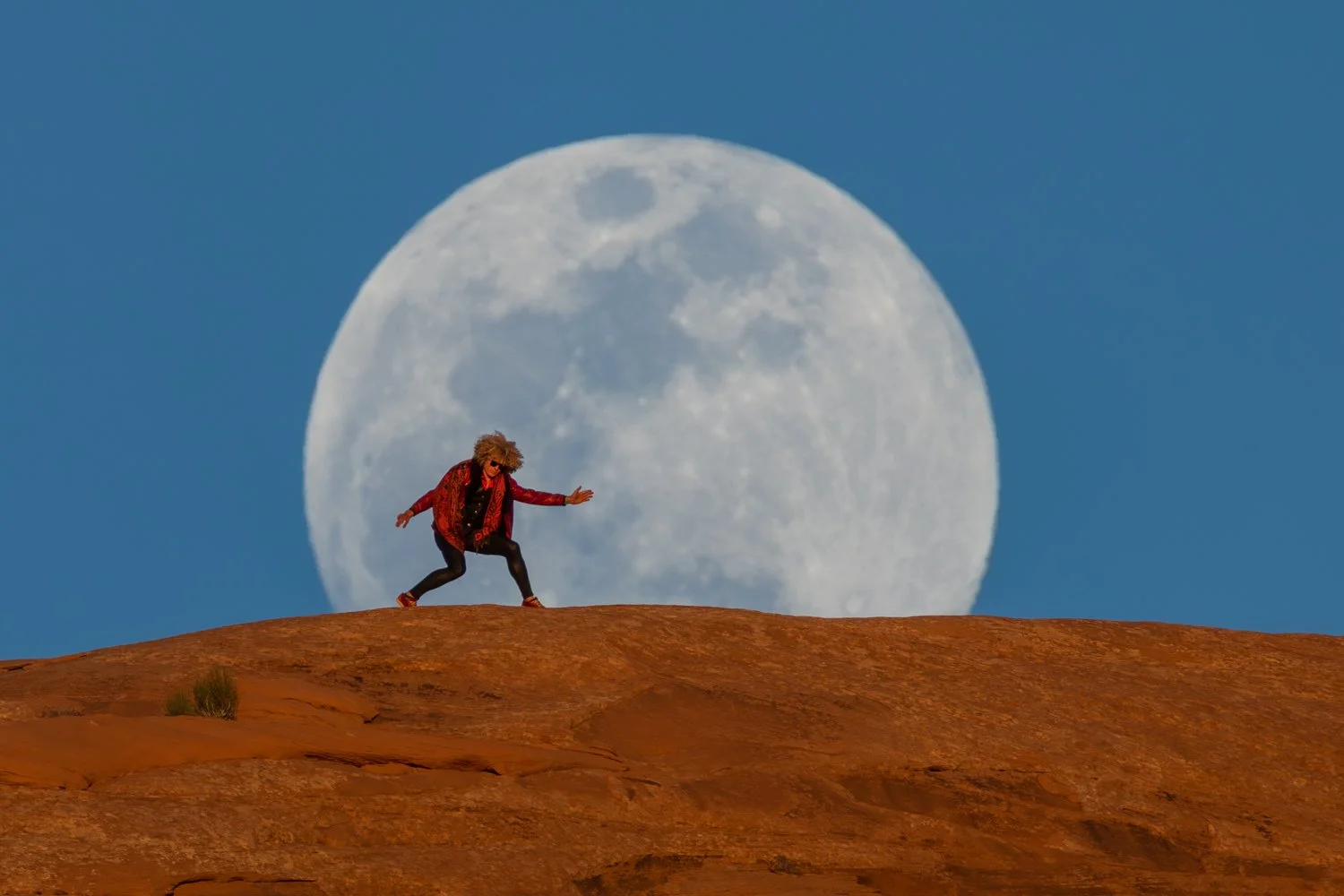 As the time approached for the moon to creep above the horizon, I’d lost visibility of Dalton as he’d disappeared behind the “fin” as we call them in Moab. I let him know we were just a couple minutes away and to get into position, but I started to get a bit nervous when it seemed like another minute went by and he still wasn’t there. Just moments before the moon began to appear, he was back at the spot, phew! I began taking photos, and Dalton began the Dalton dance. With the moon moving its own diameter in about two minutes, that’s about all the time you have to shoot the moon passing behind someone. If the terrain permits however, you can reposition yourself and your camera to experience the moonrise multiple times. As you move towards your subject, things will appear larger, so in this case the rock fin which was my horizon “moved” up, eventually obscuring the moon again. In this area, I had relatively nice and small hills to work with, so I would move forward, letting Dalton know over the radio that he could take a little break as I was repositioning myself and my gear. It’s also helpful to know that moving closer to your subject affects the apparent size of the moon, since whatever is on the ground will appear larger as you approach, effectively “shrinking” the moon. You can learn more about big moon photos like these in a special blog I wrote a few years back, and if you’re interested in other ways that you can “move” the moon while photographing it, I made a list of rules in another “Behind the Shots” post. I repositioned myself about 6 times, giving us about 15 minutes total of shooting the moon rising behind Dalton. I eventually ran into a hill that wasn’t so easy to navigate, and our illumination was now gone since the sun set, so I let him know I’d meet him back where we started.